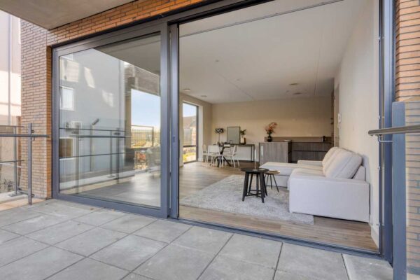 Vanuit de living loopt u direct het zonnige balkon (13 m²) op, gelegen op het noordwesten. Het balkon biedt voldoende plek voor een loungeset én eettafel. Optioneel kunt u met glazen schuifpanelen een serre creëren (vergunningsplichtig).