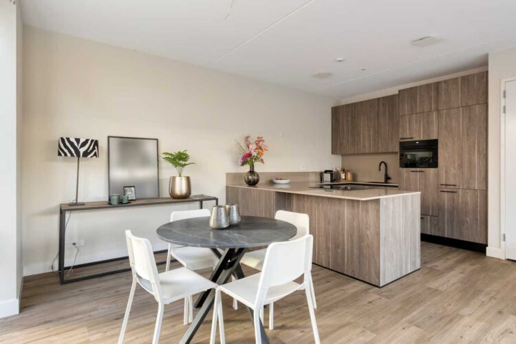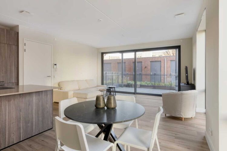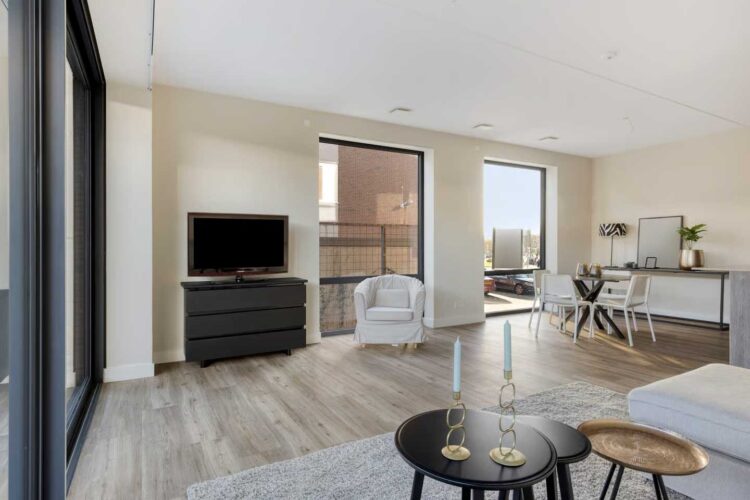 De royale woonkamer met open keuken (ca. 40 m²) vormt het hart van het appartement. Grote ramen zorgen voor overvloedig daglicht, terwijl de moderne afwerking en neutrale kleuren een stijlvolle, rustige sfeer creëren. Hier is volop ruimte voor een gezellige zithoek en een grote eettafel.