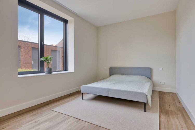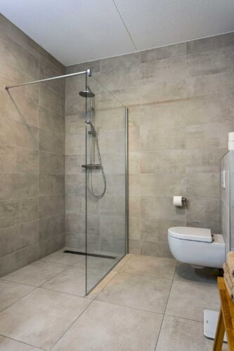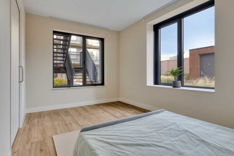 Het appartement beschikt over twee ruime slaapkamers. De hoofdslaapkamer biedt plaats aan een groot bed en kastenwand; de tweede kamer is ideaal als logeer- of werkkamer. De badkamer is luxe uitgevoerd met een brede inloopdouche (met regendouche en steunbeugels), dubbel wastafelmeubel in eiken uitvoering en tweede toilet, strak, fris en tijdloos.